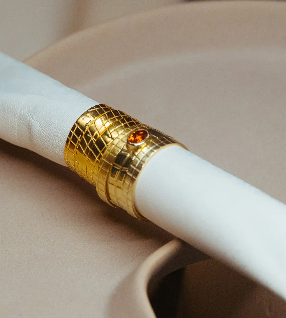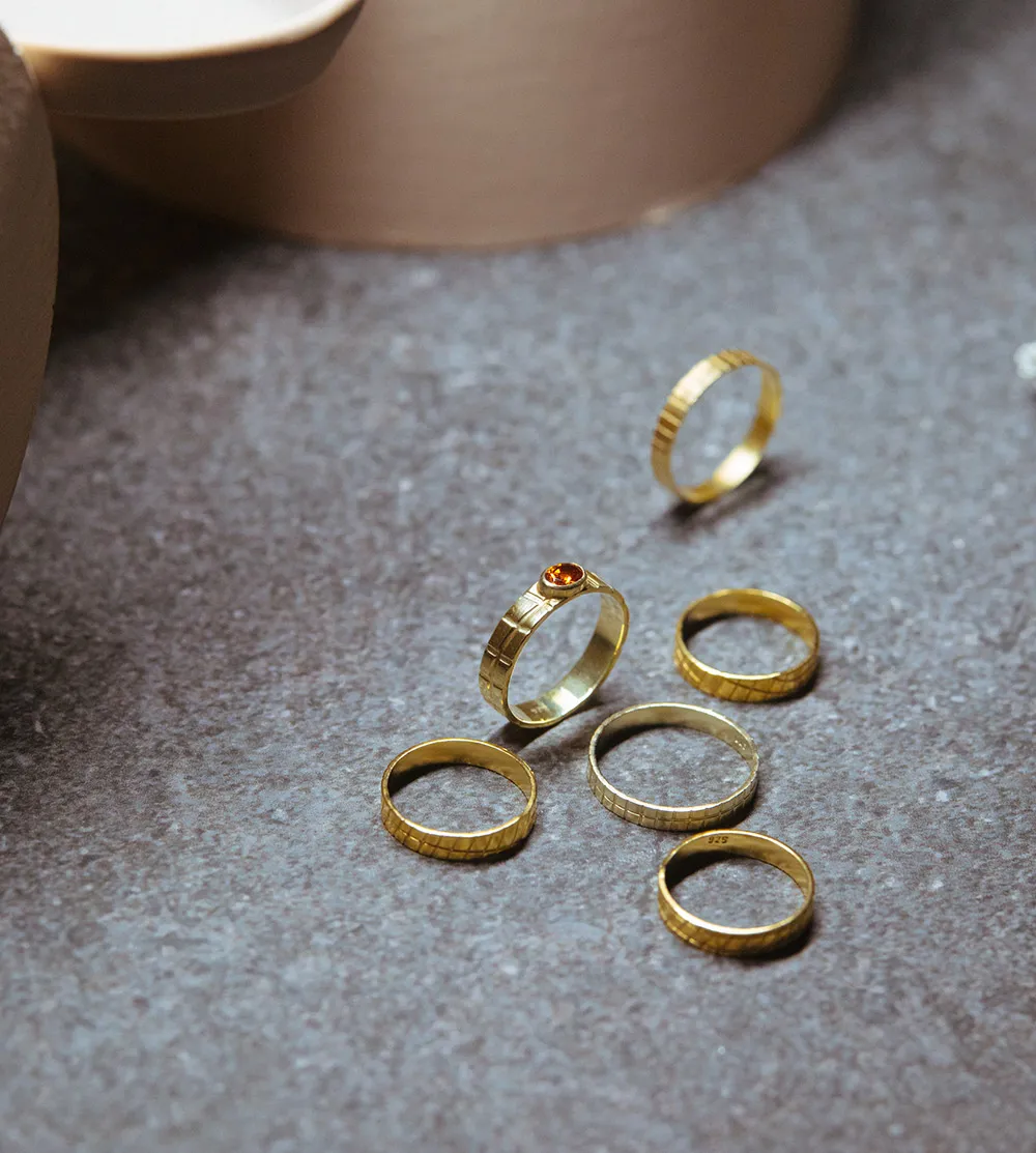 Ένα λεπτό, ανάγλυφο δαχτυλίδι με έναν ζωηρό, πορτοκαλί γρανάτη. Η φλόγα της πέτρας συνδυάζεται με την τραχιά υφή του χαραγμένου ασημιού για ένα κόσμημα που ξεχωρίζει.