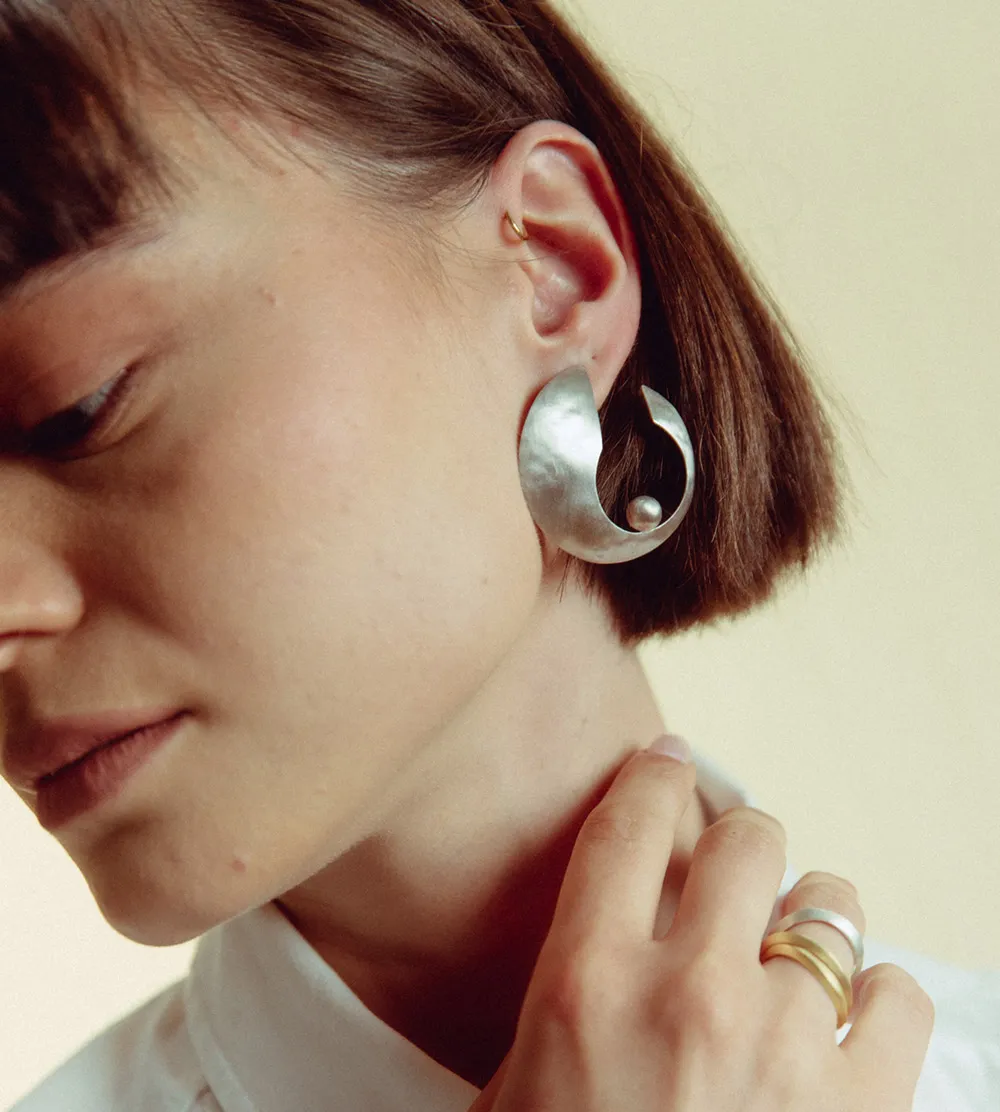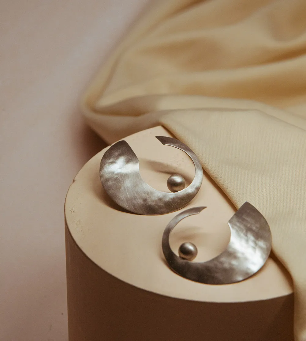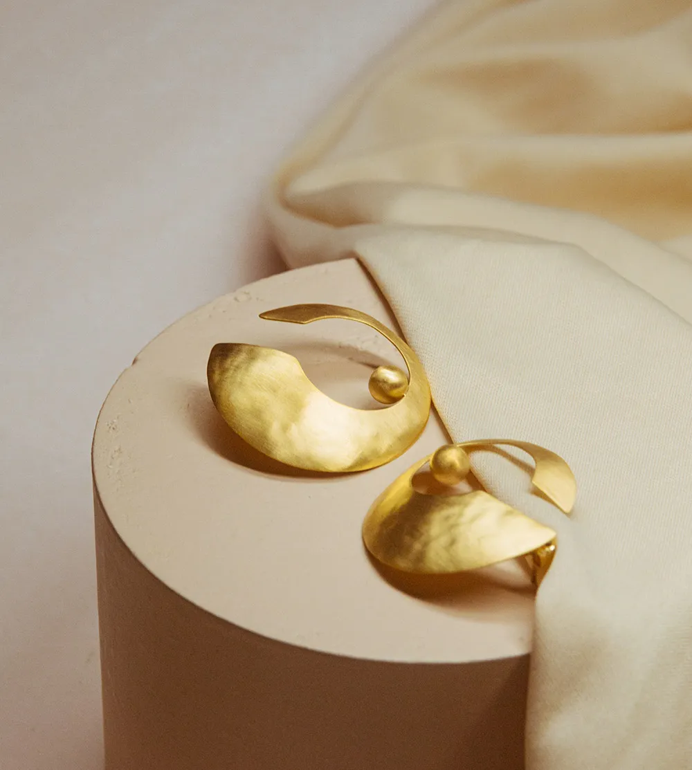 Σκουλαρίκια με γλυπτική διάθεση και γεωμετρική ισορροπία. Τα Eclipse αναπαριστούν την έννοια της έκλειψης μέσα από δύο έντονες καμπύλες που αγκαλιάζουν το αυτί. Ένα κόσμημα με έντονη προσωπικότητα, εμπνευσμένο από την αρχιτεκτονική φόρμα και την κοσμική συμμετρία.